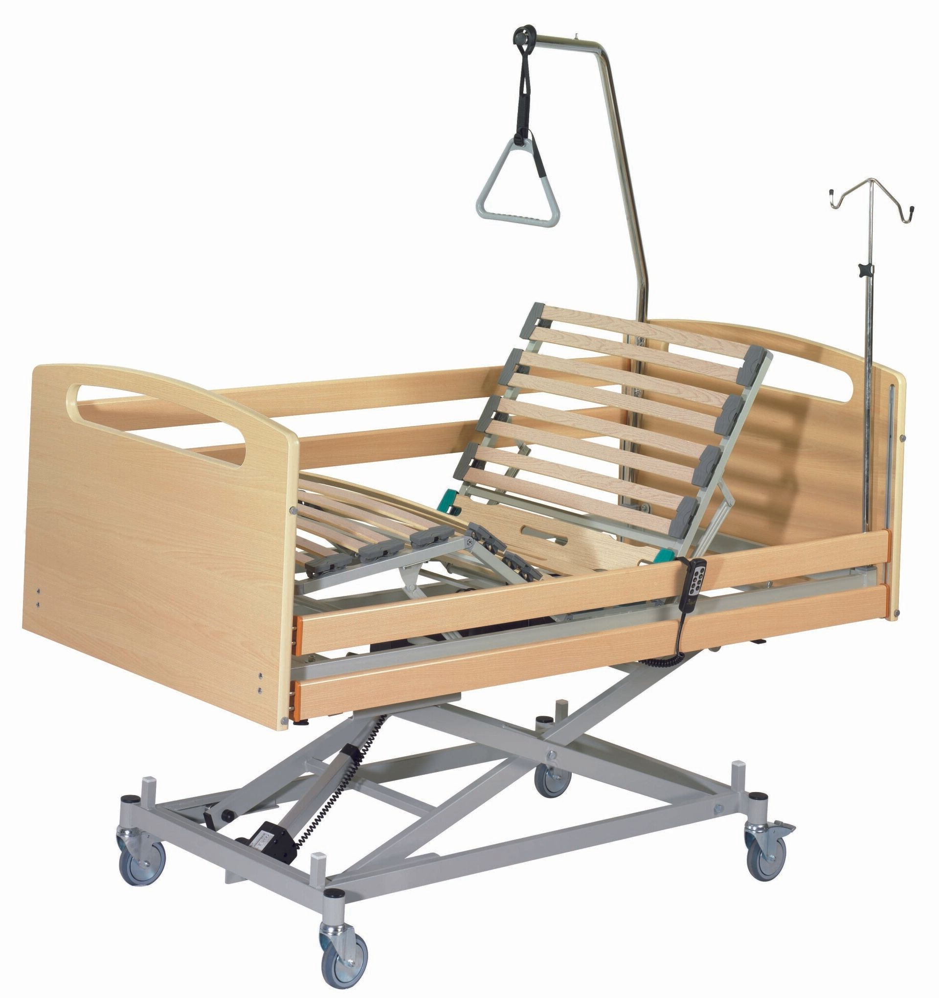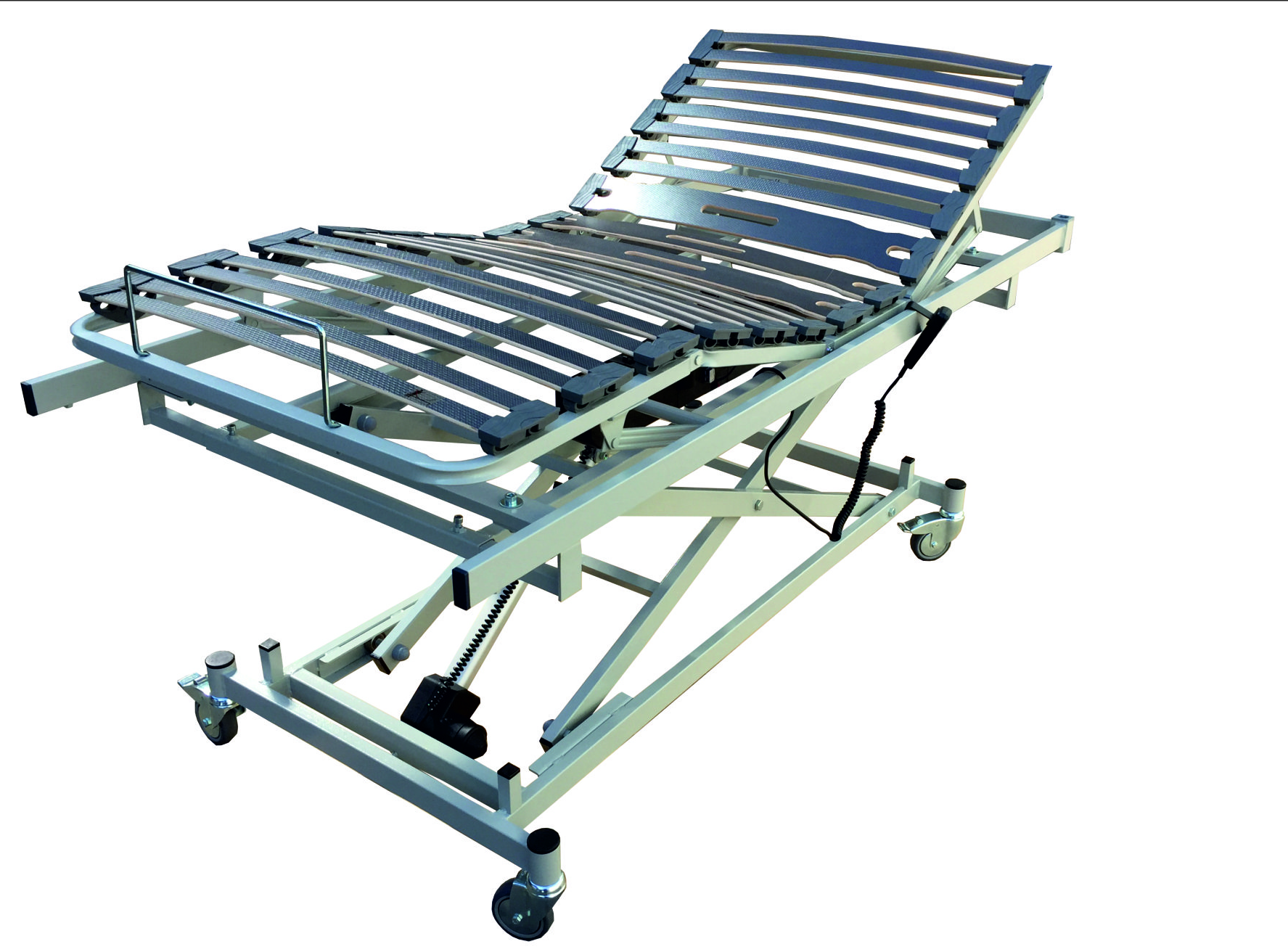 Cama para uso geriátrico, articulada de cuatro planos y tres articulaciones, con sistema de elevación. Accionamiento eléctrico mediante 2 motores eléctricos de tecnología alemana, de baja tensión (24 voltios), con pila de emergencia función REST para su puesta a cero en caso de corte del suministro eléctrico.