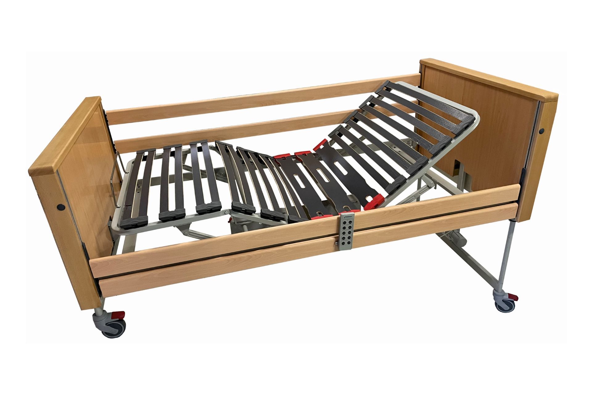 Cama para uso geriátrico, articulada de cuatro planos y tres articulaciones, con sistema de elevación. Accionamiento eléctrico mediante 2 motores eléctricos de tecnología alemana, de baja tensión (24 voltios), con pila de emergencia función REST para su puesta a cero en caso de corte del suministro eléctrico.