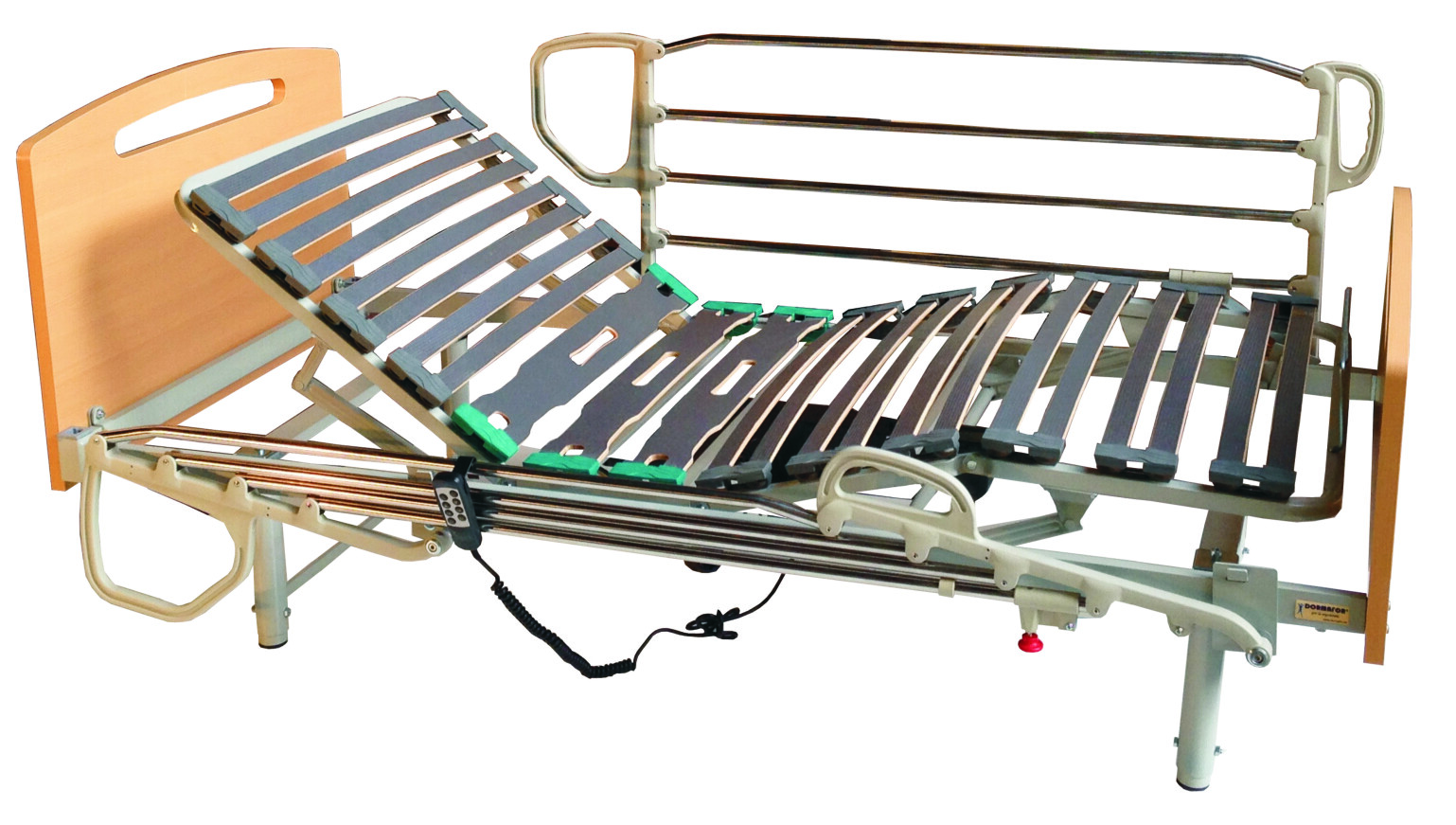 Cama para uso geriátrico articulada de cuatro planos y tres articulaciones, con accionamiento mediante motor eléctrico de 4000 N, de baja tensión (24 voltios), con pila de emergencia función REST para su puesta a cero en caso de corte del suministro eléctrico. Protección tipo IPX 4.